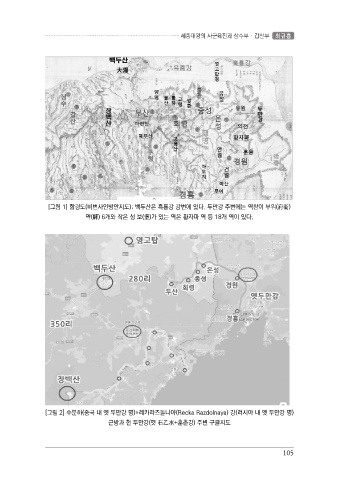 세종대왕의 사군육진과 삼수부 · 갑산부 최규흥 [그림 1] 함경도(비변사인방안지도); 백두산은 흑룡강 강변에 있다. 두만강 주변에는 역참이 부위(府衛) 역(驛) 6개와 작은 성 보(堡)가 있는 역은 황자파 역 등 18개 역이 있다. [그림 2] 수분하(중국 내 옛 두만강 명)+레카라즈돌나야(Recka Razdolnaya) 강(러시아 내 옛 두만강 명) 근방과 현 두만강(옛 石乙水+훈춘강) 주변 구글지도 105