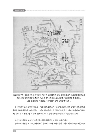 [그림 5] 광여도-경원부 고지도: 두만강에 고욕이도(古慾耳島)가 있다. 솔하천과 회개천 사이에 경원부위가