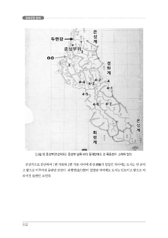 동북공정 분과 [그림 9] 종성부(조선지도): 종성부 남쪽 바다 동해안에도 강 목동천이 그려져 있다. 위상적으로 판단하여 1번 지류와 2번 지류 사이에 종성 府衛가 있었던 자리에는 도시는 안 보이 고 밭으로 이루어진 들판만 보인다. 북행영(北行營)이 있었던 자리에도 도시는 안보이고 밭으로 이 루어진 들판만 보인다. 112