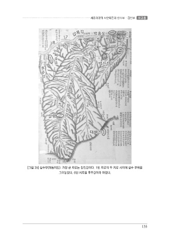 세종대왕의 사군육진과 삼수부 · 갑산부 최규흥 [그림 35] 삼수부(해동지도): 가장 큰 지류는 장진강이다. 1번 지류의 두 지류 사이에 삼수 부위를 그려놓았다. 6번 지류를 후주강이라 하였다. 135