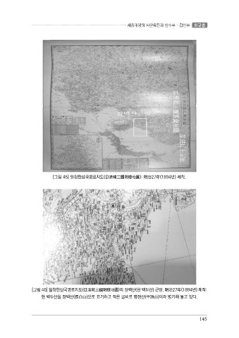 세종대왕의 사군육진과 삼수부 · 갑산부 최규흥 [그림 45] 일청한삼국명료지도(日淸韓三國明瞭地圖): 明治27年(1894년) 제작. [그림 46] 일청한삼국명료지도(日淸韓三國明瞭地圖)의 장백산(현 백두산) 근방, 明治27年(1894년) 제작: 현 백두산을 장백산(長白山)으로 표기하고 작은 글씨로 평정산(平頂山)이라 병기해 놓고 있다. 145