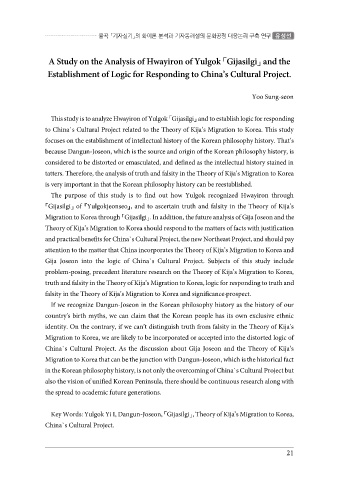 Key Words: Yulgok Yi I, Dangun-Joseon, 「Gijasilgi」, Theory of Kija’s Migration to Korea,
