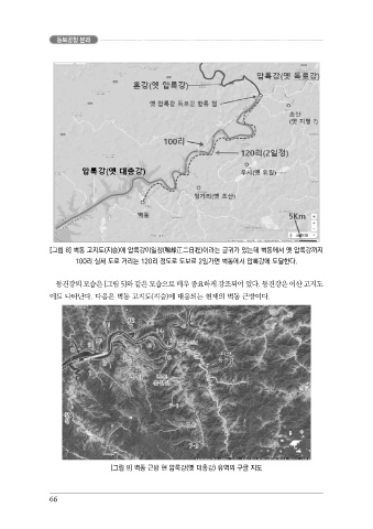 100리 실제 도로 거리는 120리 정도로 도보로 2일가면 벽동에서 압록강에 도달한다.