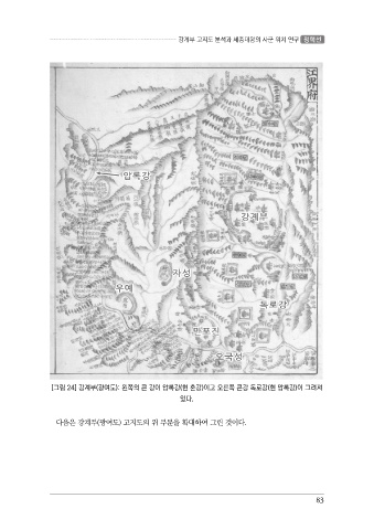 강계부 고지도 분석과 세종대왕의 사군 위치 연구 정택선 [그림 24] 강계부(광여도): 왼쪽의 큰 강이 압록강(현 혼강)이고 오른쪽 큰강 독로강(현 압록강)이 그려져 있다. 다음은 강계부(광여도) 고지도의 위 부분을 확대하여 그린 것이다. 83