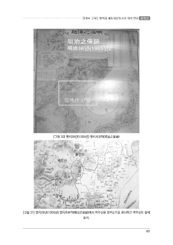 강계부 고지도 분석과 세종대왕의 사군 위치 연구 정택선 [그림 30] 명치38년(1905년) 명치지위적(明治之偉跡) [그림 31] 명치38년(1905년) 명치지위적(明治之偉跡)에서 백두산을 장백산으로 표시하고 백두산도 함께 표시. 89