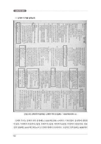 동북공정 분과 ⌬강계부 주기를 살펴보자. [그림 34] 강계부주기(광여도): 강계부 부위 성 둘레는 14660척(4398 m). 강계부 주기는 강계부 부위 성 둘레는 14660척(4398 m)이라고 기록되었다. 동남쪽에 설한령 이 있다. 부위에서 자성까지 2일정, 우예까지 3일정, 여연까지 6일정, 무창까지 5일정이다. 만포 진의 성둘레는 6640척(1992m)이고 강계부위에서 150리이다. 고산리진 성의 둘레는 8688척이 92