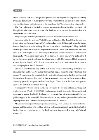 Homogeneity between Sumer and Korea appears in the customs of food, clothing, and