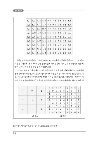 능한 수의 배열은 대략 83만 개의 9차 라틴방진 중 하나가 스도쿠의 배열이 되는 셈이다. 18)