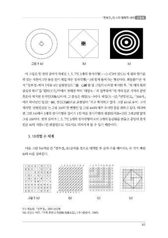 그림 4⒝이다. 변의 길이가 1, 5, 7인 3개의 정사각형이 ⒞의 3개의 동심원을 만들고 중앙의 흰색