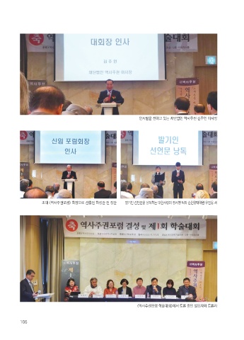 인사말을 전하고 있는 재단법인 역사주권 김주인 이사장 초대 <역사주권포럼> 회장으로 선출된 허성관 전 장관 발기인 선언문을 낭독하는 대한사랑의 정서영 씨와 순천향대학원 유진웅 씨 <역사주권포럼 학술대회>에서 토론 중인 발표자와 토론자 106