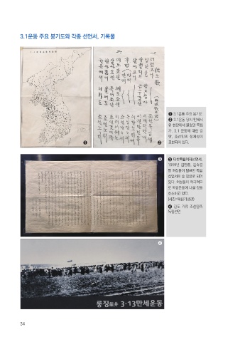 3.1운동 주요 봉기도와 각종 선언서, 기록물 ➊ 3.1운동 주요 봉기도 ➋ 3.1운동 당시 만세시 위 현장에서 불렀던 독립 가. 3.1 운동에 대한 감 탄, 조선인의 정체성이 ➊ ➋ 표현되어 있다. ➌ ➌ 대한독립여자선언서. 1919년 김인종, 김숙경 등 여성들이 발표한 독립 선언서로 순 한글로 되어 있다. 여성들이 적극적으 로 독립운동에 나설 것을 호소하고 있다. (사진=독립기념관) ➍ 간도 거류 조선민족 독립선언 ➍ 34