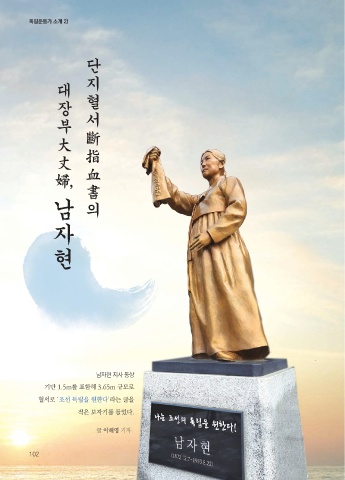 독립운동가 소개 2) 단 대 지 장 혈 부 서 大 斷 丈 指 婦, 血 書 남 의 자 현 남자현 지사 동상 기단 1.5m를 포함해 3.65m 규모로 혈서로 '조선 독립을 원한다'라는 글을 적은 보자기를 들었다. 글 이해영 기자 102 월간대한사랑_8,9호_본문(인쇄).indd 102 2024-07-22 오후 1:51:18