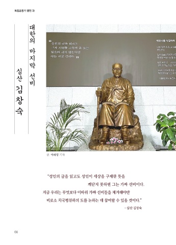 독립운동가 열전 3) 글. 이해영 기자 “성인의 글을 읽고도 성인이 세상을 구제한 뜻을 깨닫지 못하면 그는 가짜 선비이다. 지금 우리는 무엇보다 이따위 가짜 선비들을 제거해야만 비로소 치국평천하의 도를 논하는 데 참여할 수 있을 것이다.” -심산 김창숙 66