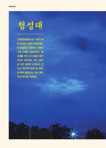 포토에세이 첨성대 선덕여왕(재위 632∼647) 때 에 축조된 신라의 천문관측소 인 첨성대는 현존하는 동양의 가장 오래된 천문대이다. 첨 성대를 짓는 데 사용된 돌의 개수는 362개로, 이는 1년의 날 수인 365와 비슷하다. 그 리고 362개의 돌로 총 28단 을 쌓아 올렸는데, 이는 별자 리의 28수를 상징한다.