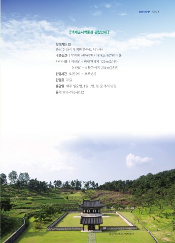 2025. 1 【백제군사박물관 관람안내】 찾아가는 길 충남 논산시 부적면 충곡로 311-54 대중교통 | 부적면 신풍리행 시내버스 307번 이용 자가이용 | 서산IC – 박물관까지 12km(20분) 논산IC – 박물관까지 20km(25분) 관람시간 오전 9시 ~ 오후 6시 관람료 무료 휴관일 매주 월요일, 1월 1일, 설 및 추석 당일 문의 041-746-8432 67 충장사 ©백제군사박물관