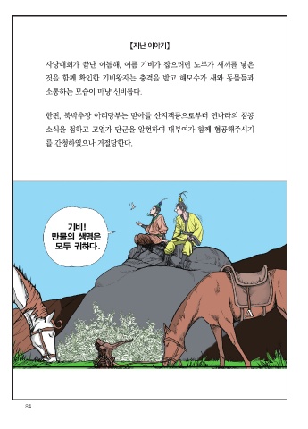 【지난 이야기】 사냥대회가 끝난 이듬해, 여름 기비가 잡으려던 노루가 새끼를 낳은 것을 함께 확인한 기비왕자는 충격을 받고 해모수가 새와 동물들과 소통하는 모습이 마냥 신비롭다. 한편, 북박추장 아리당부는 맏아들 산지객륭으로부터 연나라의 침공 소식을 접하고 고열가 단군을 알현하여 대부여가 함께 협공해주시기 를 간청하였으나 거절당한다. 84