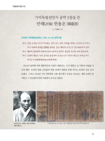 만해 한용운 ⓒ독립기념관 한국독립 기미독립선언서 中 공약 3장과 한용운의 이름 ⓒ한국학 중앙연구원