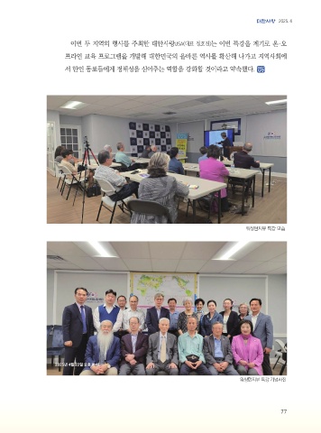 2025. 6 이번 두 지역의 행사를 주최한 대한사랑USA(대표 정호진)는 이번 특강을 계기로 온·오 프라인 교육 프로그램을 개발해 대한민국의 올바른 역사를 확산해 나가고 지역사회에 서 한인 동포들에게 정체성을 심어주는 역할을 강화할 것이라고 약속했다. 워싱턴지부 특강 모습 워싱턴지부 특강 기념사진 77