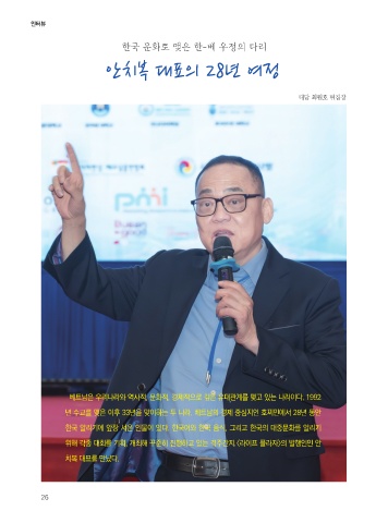 인터뷰 대담 최원호 편집장 베트남은 우리나라와 역사적, 문화적, 경제적으로 깊은 유대관계를 맺고 있는 나라이다. 1992 년 수교를 맺은 이후 33년을 맞이하는 두 나라. 베트남의 경제 중심지인 호찌민에서 28년 동안 한국 알리기에 앞장 서온 인물이 있다. 한국어와 한국 음식, 그리고 한국의 대중문화를 알리기 위해 각종 대회를 기획, 개최해 꾸준히 진행하고 있는 격주간지 <라이프 플라자>의 발행인인 안 치복 대표를 만났다. 26