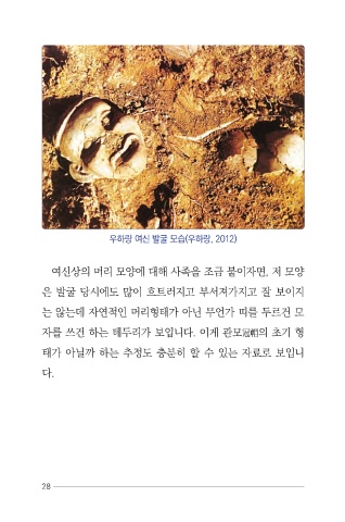 우하량 여신 발굴 모습(우하량, 2012) 여신상의 머리 모양에 대해 사족을 조금 붙이자면, 저 모양 은 발굴 당시에도 많이 흐트러지고 부서져가지고 잘 보이지 는 않는데 자연적인 머리형태가 아닌 무언가 띠를 두르건 모 자를 쓰건 하는 테두리가 보입니다. 이게 관모冠帽의 초기 형 태가 아닐까 하는 추정도 충분히 할 수 있는 자료로 보입니 다. 28 어서와 10강 송옥진-홍산문화와 홍익인간.indd 28 2022-03-04 16:09:02