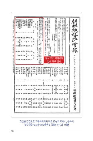 공식 조선 역사서적 압수 목록 명시 조선을 강압으로 지배하자마자 바로 조선의 역사서, 문화서 압수령을 선포한 조선총독부 관보(1910년 11월) 50 어서와 1강.indd 50 2021-10-18 13:17:20