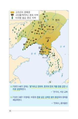 Y 기원전 4세기 경에는 ‘왕’이라고 칭하며, 중국의 연과 겨룰 만큼 강한 나 라로 성장하였다. - 「한국사」 비상 교육 Y 기원전 3세기 무렵에는 부왕과 준왕 같은 강력한 왕이 등장하여 왕위를 세습하였다. - 「한국사」 동아출판 36 어서와 2강.indd 36 2021-04-07 22:05:18