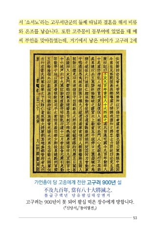 서 ‘소서노’라는 고무서단군의 둘째 따님과 결혼을 해서 비류 와 온조를 낳습니다. 또한 고주몽이 동부여에 있었을 때 예 씨 부인을 맞아들였는데, 거기에서 낳은 아이가 고구려 2세 가언충이 당 고종에게 전한 고구려 900년 설 不及九百年, 當有八十大將滅之. 불급구백년 당유팔십대장멸지 고구려는 900년이 못 되어 팔십 먹은 장수에게 망합니다. (『신당서』「동이열전」) 53 어서와 4강.indd 53 2021-05-26 16:02:54