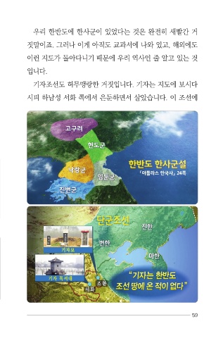 우리 한반도에 한사군이 있었다는 것은 완전히 새빨간 거 짓말이죠. 그러나 이게 아직도 교과서에 나와 있고, 해외에도 이런 지도가 돌아다니기 때문에 우리 역사인 줄 알고 있는 것 입니다. 기자조선도 허무맹랑한 거짓입니다. 기자는 지도에 보시다 시피 하남성 서화 쪽에서 은둔하면서 살았습니다. 이 조선에 59 어서와 6강.indd 59 2021-10-18 11:52:40