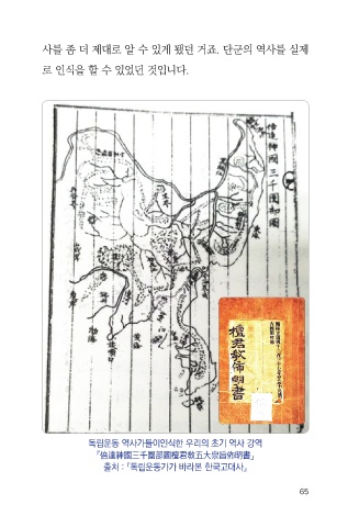 사를 좀 더 제대로 알 수 있게 됐던 거죠. 단군의 역사를 실제 로 인식을 할 수 있었던 것입니다. 독립운동 역사가들이인식한 우리의 초기 역사 강역 『倍達神國三千團部圖檀君敎五大宗旨佈明書』 출처 : 『독립운동가가 바라본 한국고대사』 65 어서와 6강.indd 65 2021-10-18 11:52:41