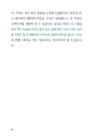 다. 아까도 제가 원문 내용을 소개해 드렸잖아요? 원문을 보 고 얘기하면 명확해지거든요. 무엇이 잘못됐는지, 또 무엇이 진짜인지를 정확히 알 수 있습니다. 앞으로 저희가 더 기획을 해서 역사 자료를 가지고 같이 읽고, 함께 얘기 나누고 이런 시간 을 가지면 좀 더 명확하게 다가오지 않을까 생각을 합니다. 지금 첫 번째 기획되는 것은 개론이라고 생각하시면 될 것 같습니 다. 88 어서와 6강.indd 88 2021-10-18 11:52:45