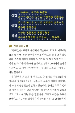이 「천부경」은 크게 세 부분으로 수 있어요. 상경上經과 중