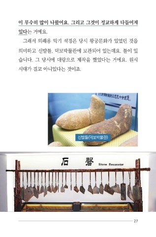 이 무수히 많이 나왔어요. 그리고 그것이 정교하게 다듬어져 있다는 거예요. 그래서 의례용 악기 석경은 당시 왕궁문화가 있었던 것을 의미하고 신발틀, 덕보박물관에 보관되어 있는데요. 틀이 있 습니다. 그 당시에 대량으로 제작을 했었다는 거에요. 원시 시대가 결코 아니었다는 것이죠. 신발틀(덕보박물관) 27 어서와 8강 교정.indd 27 2022-02-04 15:25:04