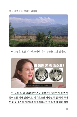 핵심 세력들로 열리게 됩니다. 이 그림은 천산, 카자흐스탄에 가서 천산을 그린 건데요. 이 동전 본 적 있습니까? 지금 유튜브에 300만이 봤고 댓 글이 8천 개가 달렸어요. 카자흐스탄 사람인데 뭘 얘기 하냐 면 바로 중간에 단군왕검이 앉아계시고 그 나라의 대표 기념 69 어서와 8강 교정.indd 69 2022-02-04 15:25:12