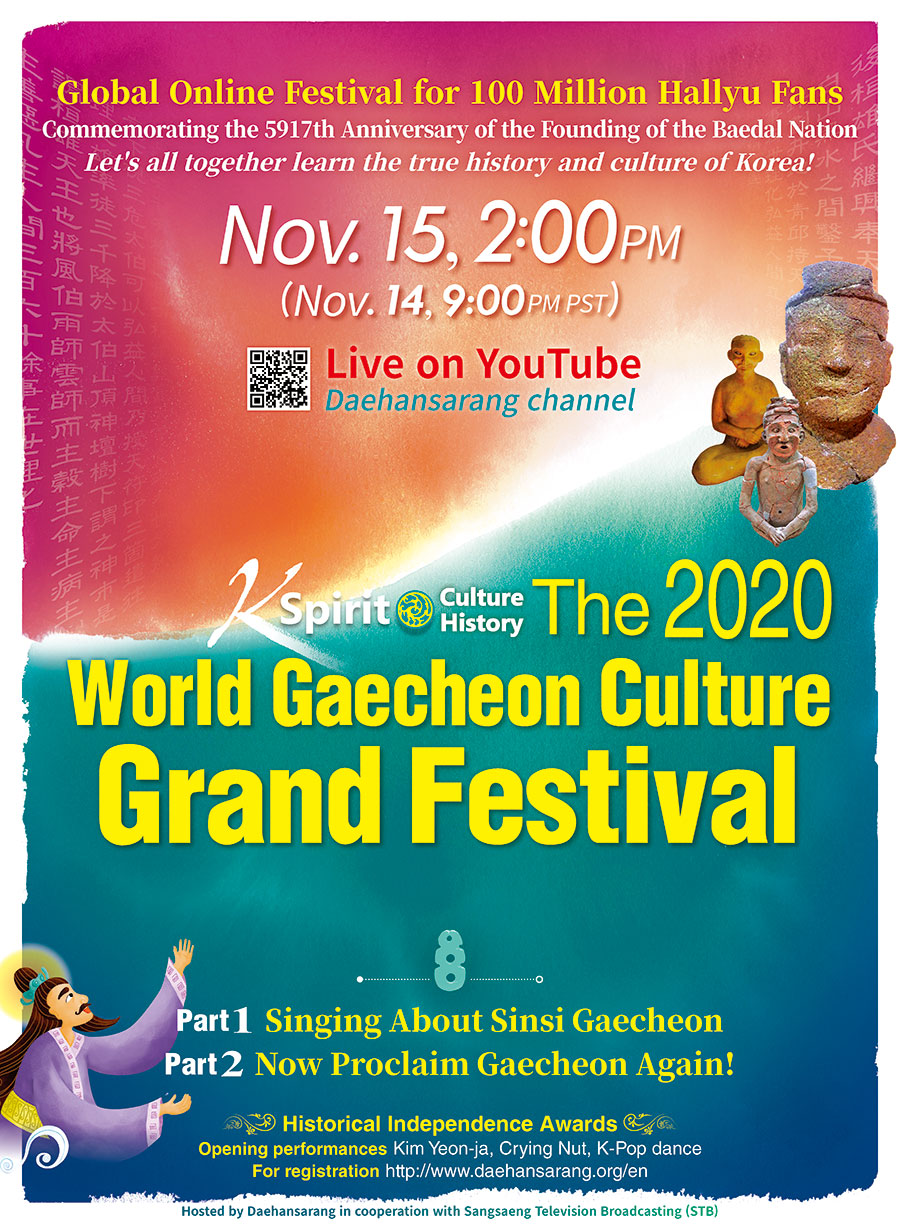 In order to commemorate the Gaecheon-jeol Day, Daehansarang Inc., is hosting an online event titled 2020 World Gaecheon Culture Grand Festival with the themes of K-Spirit, K-Culture, and K-History.