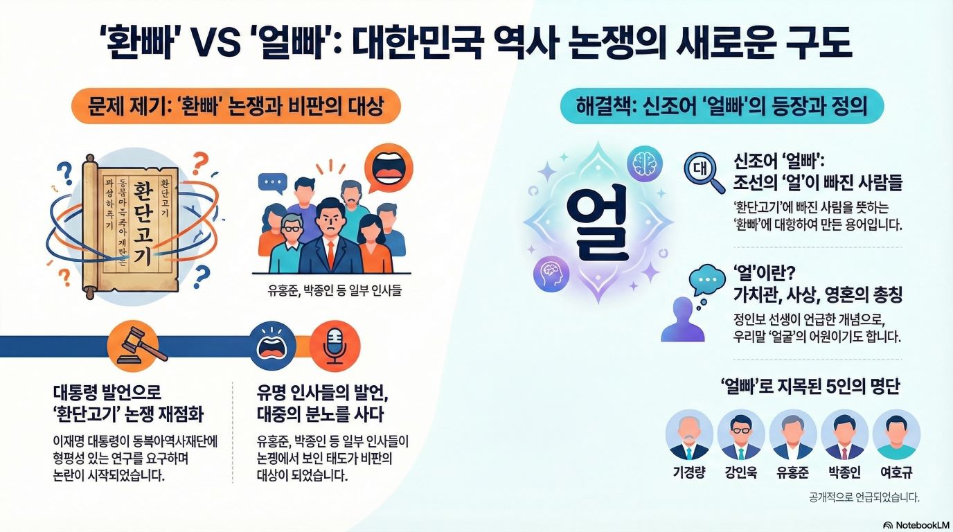지금까지 환단고기를 부정적으로 보는 이들이 조롱의 의미로 쓰는 '환빠'(환단고기에 빠진 사람들)라는 말과 대비해 우리도 이들에게 이름을 지어주고자 한다. 일명 '얼빠'(대한의 얼이 빠진 사람들)다. 위당 정인보 선생은 조선사연구라는 책에서 '얼'사상을 언급하고 있다. 얼은 일종의 가치관, 이념, 사상, 소울, 스피릿 등을 총망라하는 개념이라 할 수 있다. 우리 신체부위로 말하는 '얼굴'이 이 '얼'이라는 것을 이해하게 해주는 최적의 단어라 할 수 있겠다.